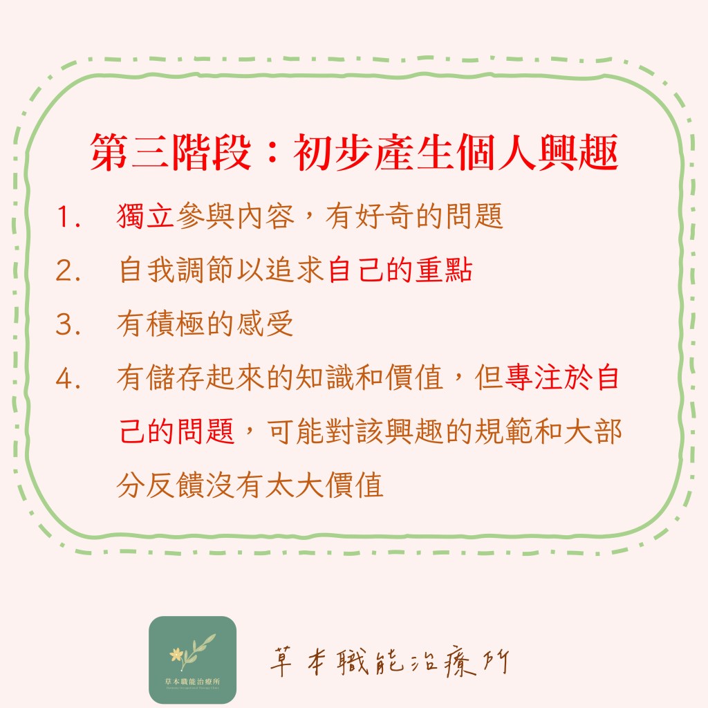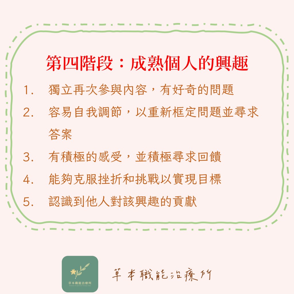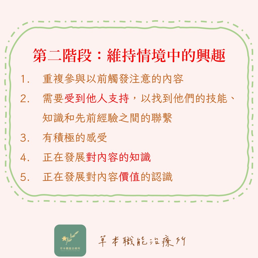 我們在發展的是「興趣」,不是「生活中必須做的事情」。 - 第二階段:維持情境中的興趣
