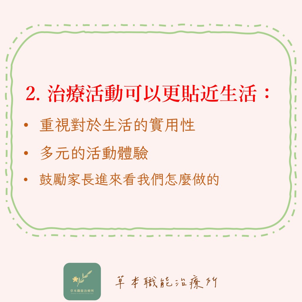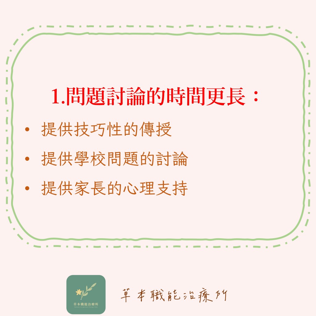 自費的時間長度,或治療師較少的案量都能夠支持我們做更多問題討論,而且在治療結束,自費治療(全長50分鐘以上)可以擁有超過10分鐘的討論機會,把整個治療中的思維好好表達給家長。來不及說完就之後用電話或LINE聯絡。 - 治療活動可以更貼近生活