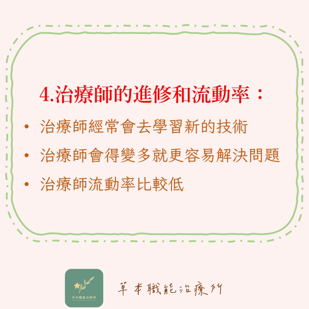 另外就是治療師的流動率問題,自費治療所的治療師通常流動率比較低,這樣有助於持續性的發展,孩子突然出現奇怪的事情(通常是行為問題),也可以透過過去的經驗找線索。 - 看得更長遠