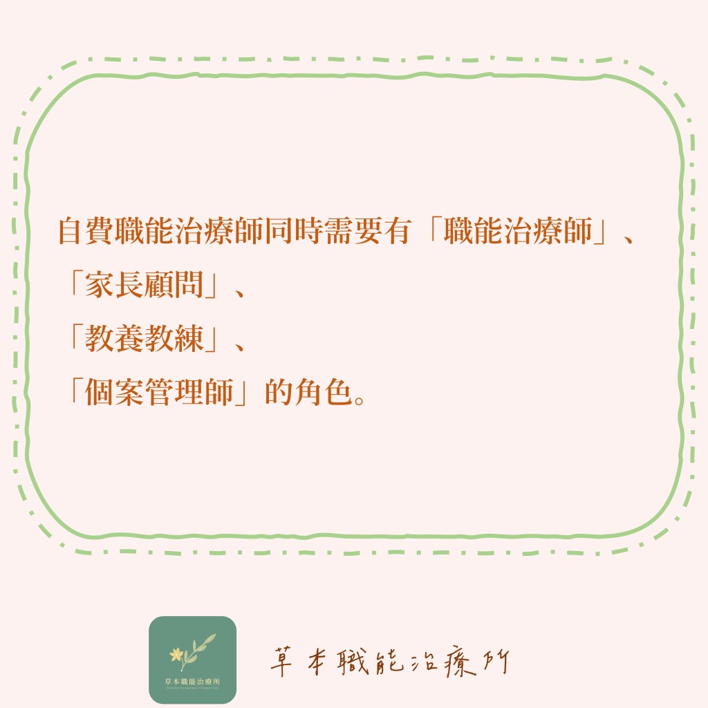 其實,自費職能治療師的角色滿複雜的,同時需要有「職能治療師」、「家長顧問」、「教養教練」、「個案管理師」的角色。