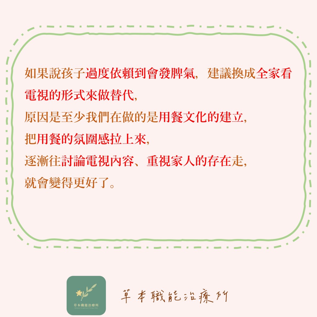 此外如果說孩子過度依賴到會發脾氣,建議換成全家看電視的形式來做替代,原因是至少我們在做的是用餐文化的建立,把用餐的氛圍感拉上來,逐漸往討論電視內容、重視家人的存在走,就會變得更好了。