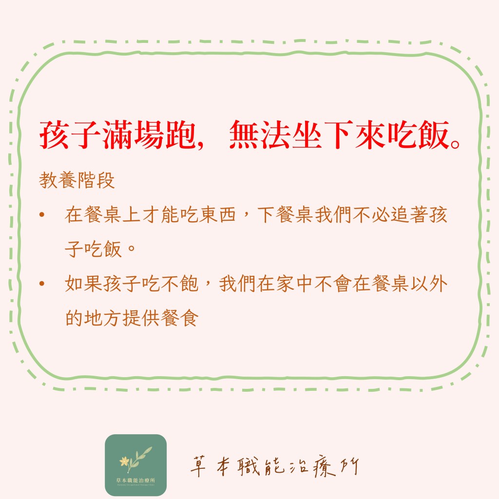 ❤️第一個要做的事情是,在餐桌上才能吃東西,下餐桌我們不必追著孩子吃飯。把環境和任務作綁定,把孩子坐好的能力誘發出來。