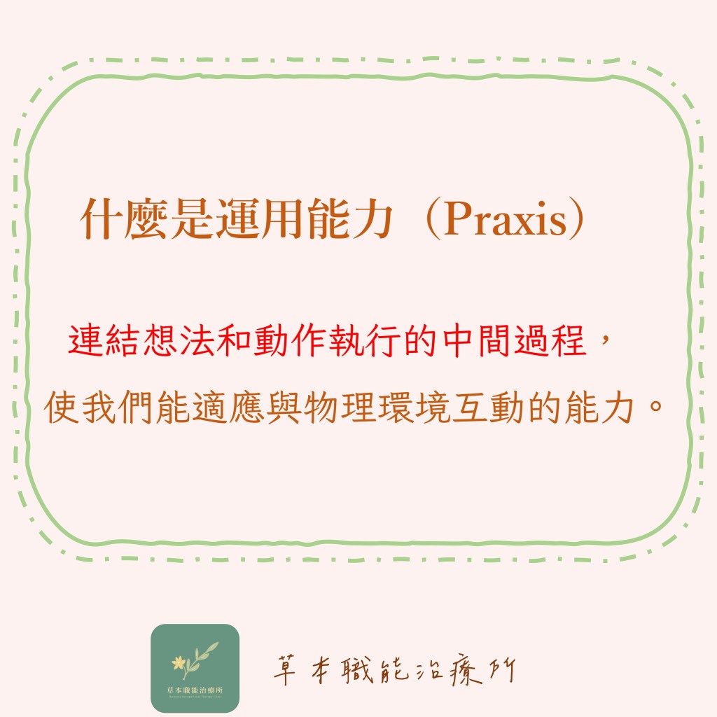 首先我們要來說一下在台灣Praxis的翻譯還滿多元的,運用能力、動作計畫、動作運用能力都有人說,那我們這邊就用「運用能力就好」。因為我們這邊主要引用的文獻是Bundy感覺統合的最新版中譯本。
