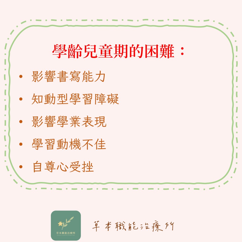 我們就會經常看到孩子用各種書寫品質的問題、複雜活動(上課要抄筆記、找到老師說的地方、聽寫等),就會出現大問題,繼而影響到成績、動機和自尊心的問題。