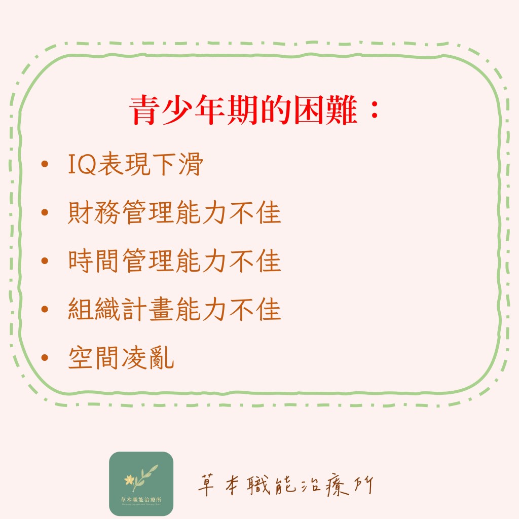 除了IQ,生活習慣也經常較差,比較容易在財務管理、計畫、組織、時間管理發生問題,也經常會出現房間凌亂、找不到東西的問題。
