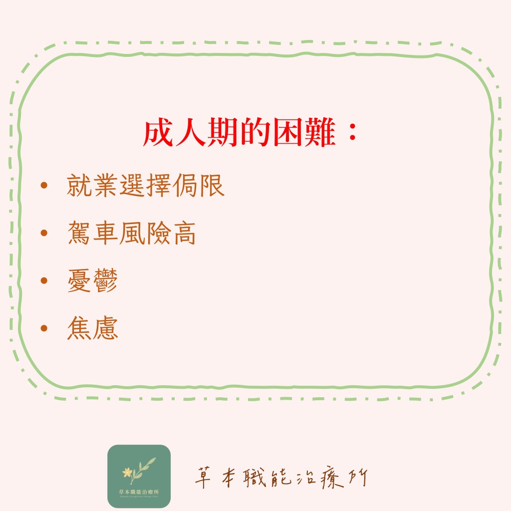這個時期最常遇到的問題就是就業和心理健康,研究有發現到他們經常會選擇不用精細操作靈巧的工作,也比較容易有焦慮和憂鬱;在駕車的時候比較難預判距離和停車、開車速度和應付干擾的能力比較不好。