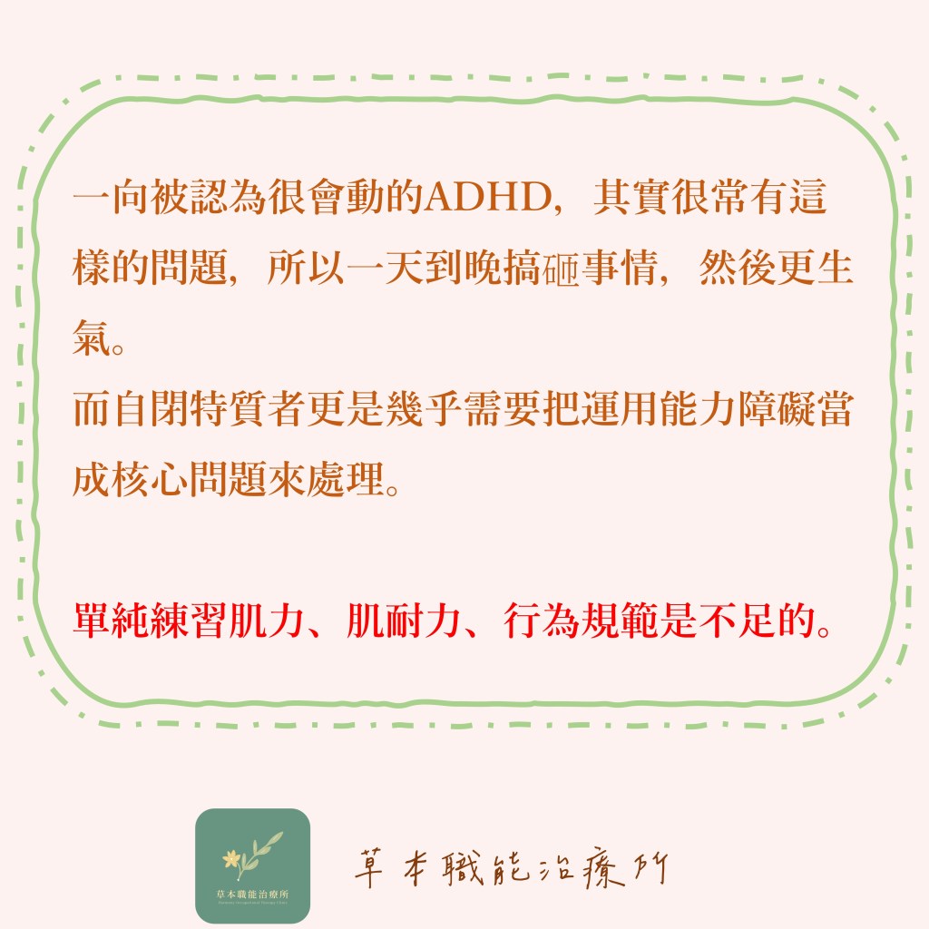 一向被認為很會動的ADHD,其實很常有這樣的問題,所以一天到晚搞砸事情,然後更生氣。而自閉特質者更是幾乎需要把運用能力障礙當成核心問題來處理。