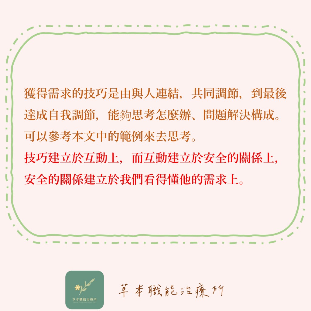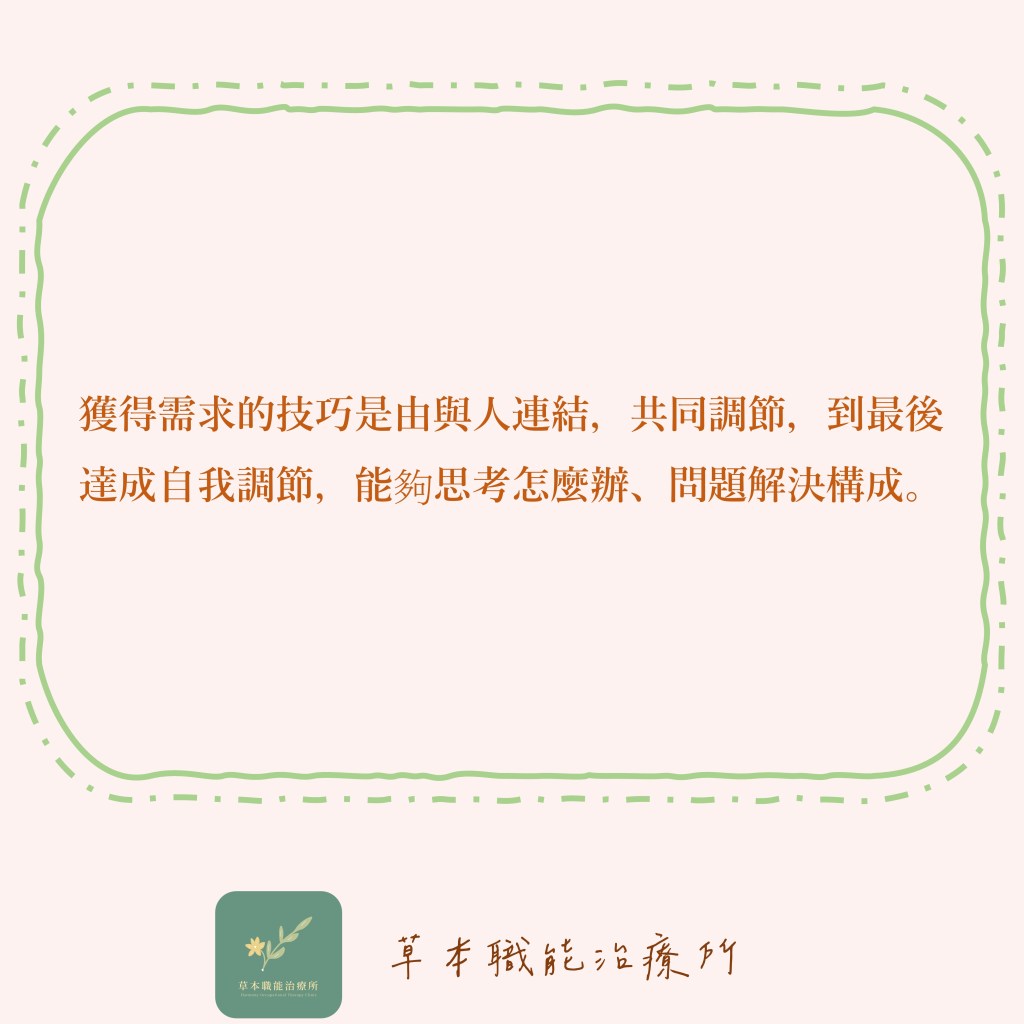 我認為獲得需求的技巧是由與人連結,共同調節,到最後達成自我調節,能夠思考怎麼辦、問題解決構成。