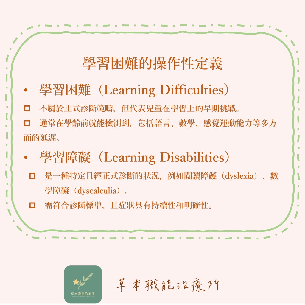 - 不屬於正式診斷範疇,但代表兒童在學習上的早期挑戰。