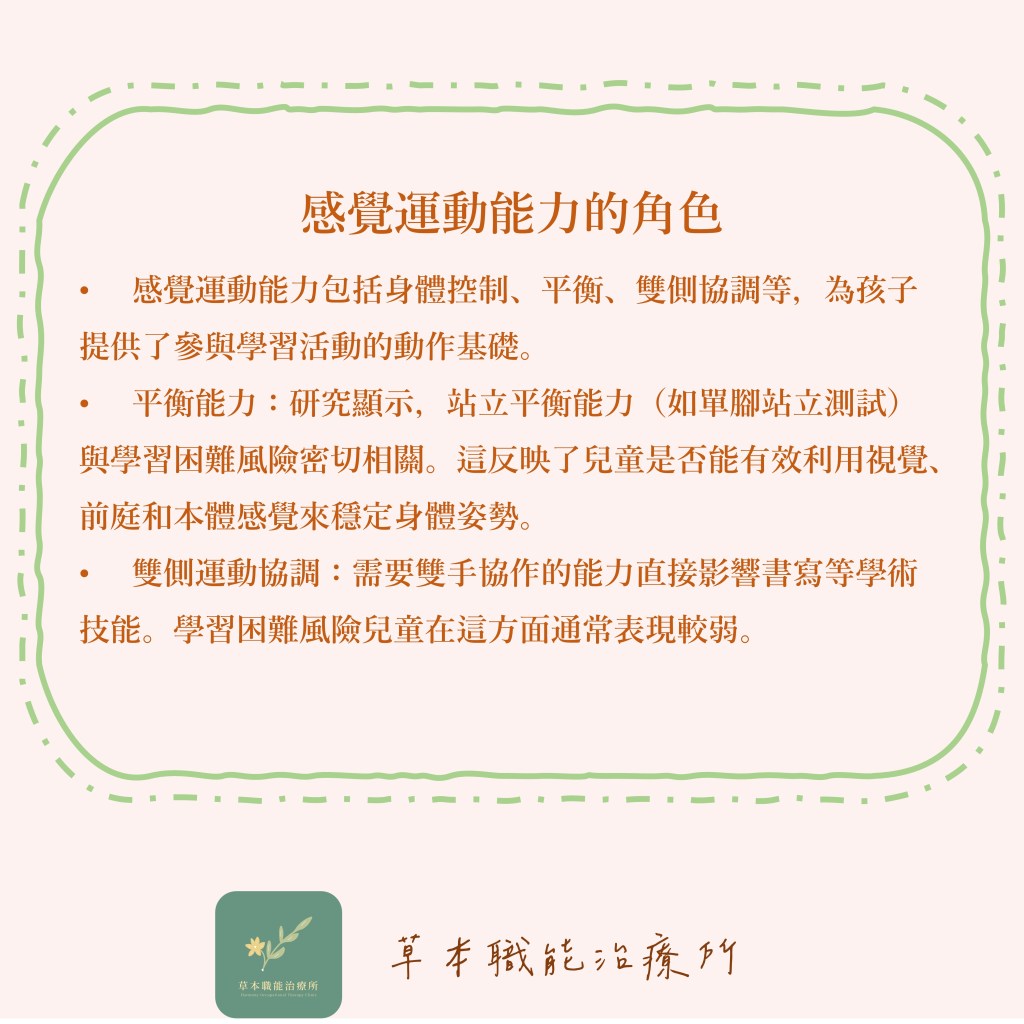 感覺運動能力包括身體控制、平衡、雙側協調等,為孩子提供了參與學習活動的動作基礎。