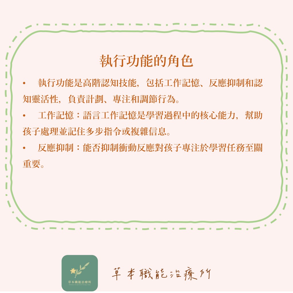 執行功能是高階認知技能,包括工作記憶、反應抑制和認知靈活性,負責計劃、專注和調節行為。