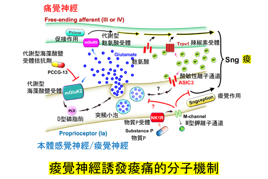 研究指出,本體感覺神經在被酸刺激後,會釋放麩胺酸(glutamate),這種興奮性神經傳導物質可以作用在鄰近的痛覺神經,讓它們更容易被啟動,進而進入慢性痛覺狀態。