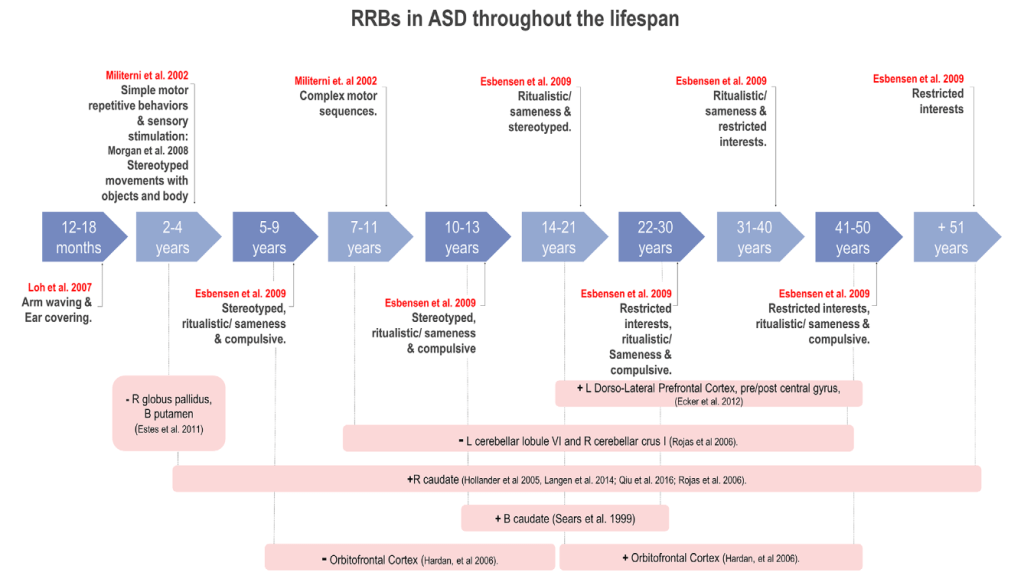 這兩種類型的行為,隨著孩子年齡與大腦發展歷程會出現不同表現,這也就是所謂的「RRBs 的發展歷程」(lifespan trajectory)。