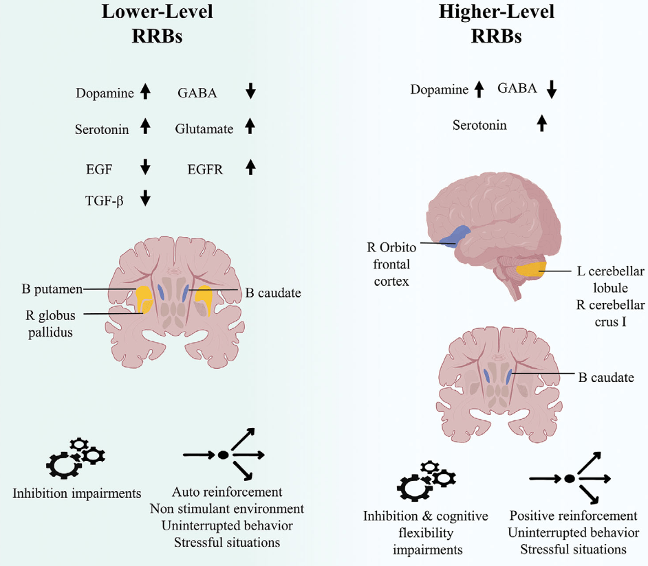- GABA(抑制性):其降低與RRBs頻率上升有關,尤其是自傷與感覺刺激行為。