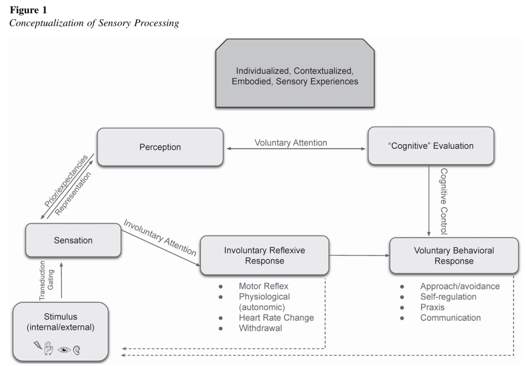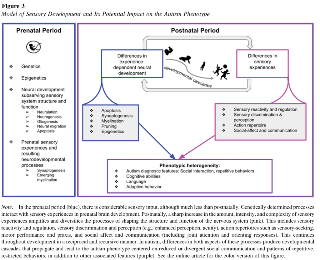 Russo, N., Cascio, C. J., Baranek, G. T., Woynaroski, T. G., Williams, Z. J., Green, S. A., Schaaf, R., & Autism Sensory Research Consortium (2025). A cascading effects model of early sensory development in autism. Psychological review, 10.1037/rev0000558. Advance online publication. https://doi.org/10.1037/rev0000558