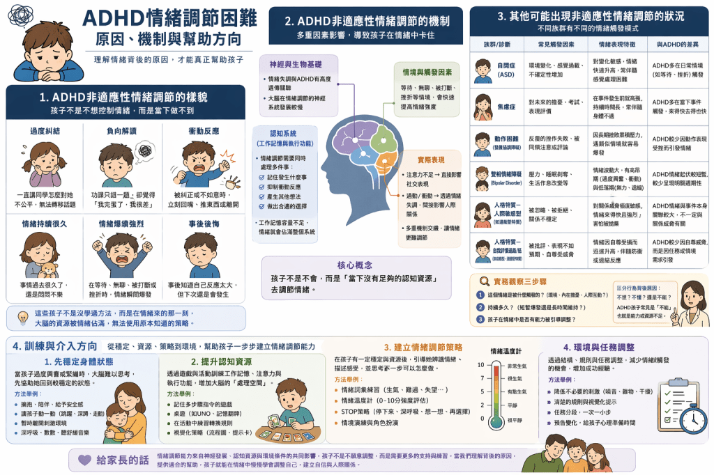 情緒失調並不是ADHD專屬的現象,許多不同的發展或心理狀況都可能出現類似表現。因此,在理解孩子的情緒困難時,除了看到表面的行為,更重要的是去辨識情緒是被什麼情境觸發的。