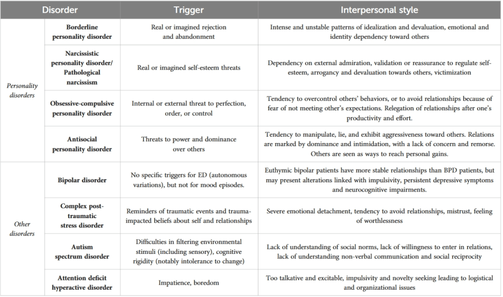 Blay, M., Duarte, M., Dessouli, M. A., Durpoix, A., Rüfenacht, E., Weibel, S., Speranza, M., & Perroud, N. (2024). Proposition of a transdiagnostic processual approach of emotion dysregulation based on core triggers and interpersonal styles. Frontiers in psychiatry, 15, 1260138. https://doi.org/10.3389/fpsyt.2024.1260138